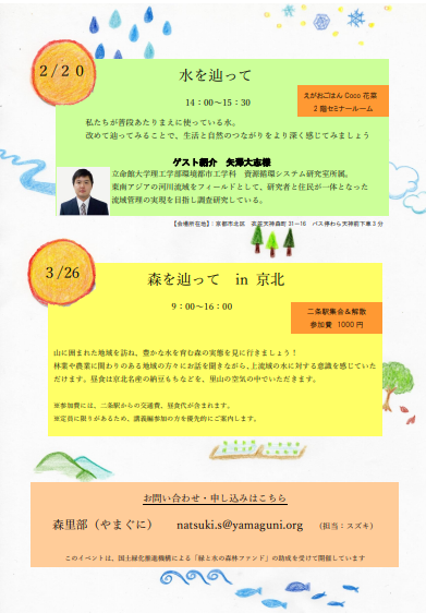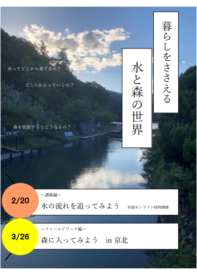 体験暮らしを支える「水と森の世界」普段の暮らしの中ではなかなか意識しづらい、自然とのつながりを改めて感じてみましょう。 第1回目では水の循環をキーワードに、水と森の関係性について講師の先生から、第2回目では、山に囲まれた京北地域を訪ね、林業や農業など、自然と深く関わりながら暮らしている方々からお話を伺います。 100年先の未来を想ってみる、きっかけをつくるイベントです。コーディネーター
